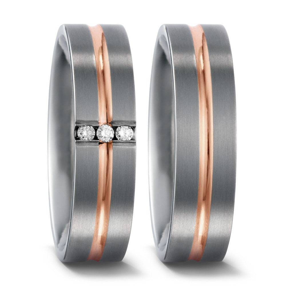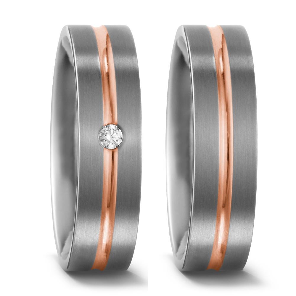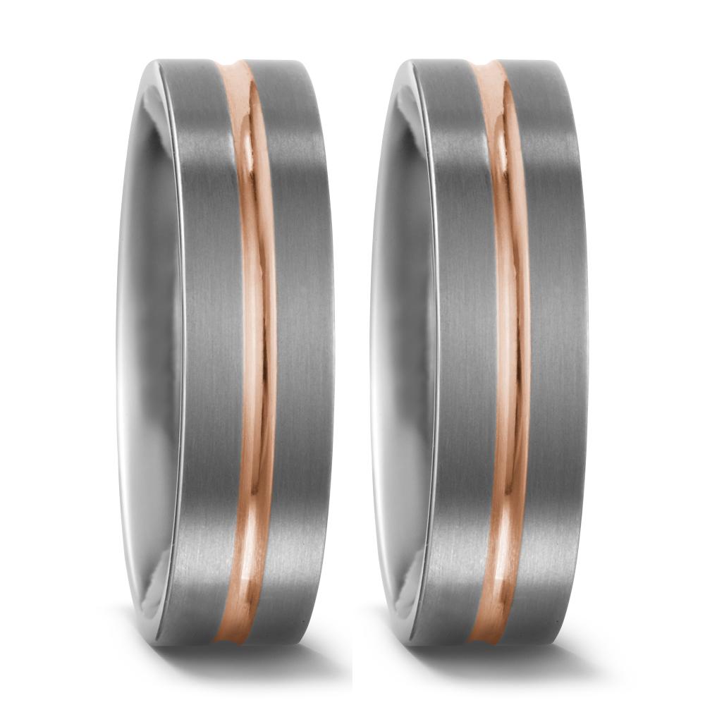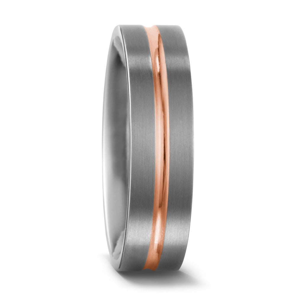 Moderner Partnerring aus widerstandsfähigem Titan mit elegantem Akzent in 750er Rotgold. Die matte Oberfläche und der feine Goldstreifen verleihen dem Ring eine besondere Kombination aus Robustheit und edlem Design – perfekt für Paare, die Stil und Beständigkeit schätzen.