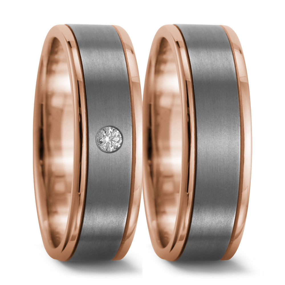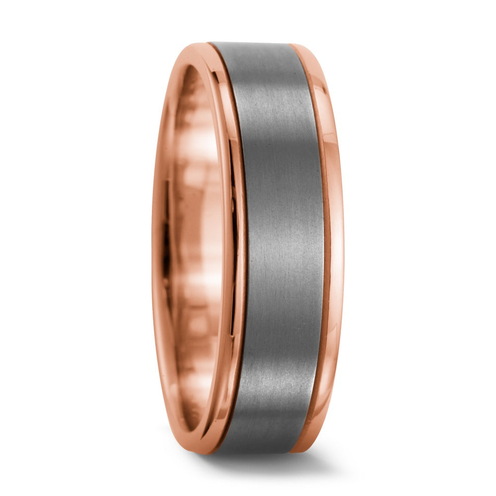 Eleganter Partnerring aus robustem Titan mit edlen Akzenten aus 750er Rotgold. Die matte Titanoberfläche wird von glänzenden Rotgoldrändern stilvoll eingerahmt – zeitloses Design für bleibende Verbundenheit. Perfekt für Paare, die Wert auf Stil und Qualität legen.