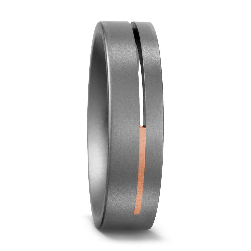 Moderner Partnerring aus robustem Titan mit feinem Akzent aus 750er Rotgold. Das matte Grau des Titans vereint sich harmonisch mit dem warmen Rotgold-Streifen zu einem eleganten Design. Perfekt für Paare, die zeitlose Qualität und stilvolles Understatement schätzen.