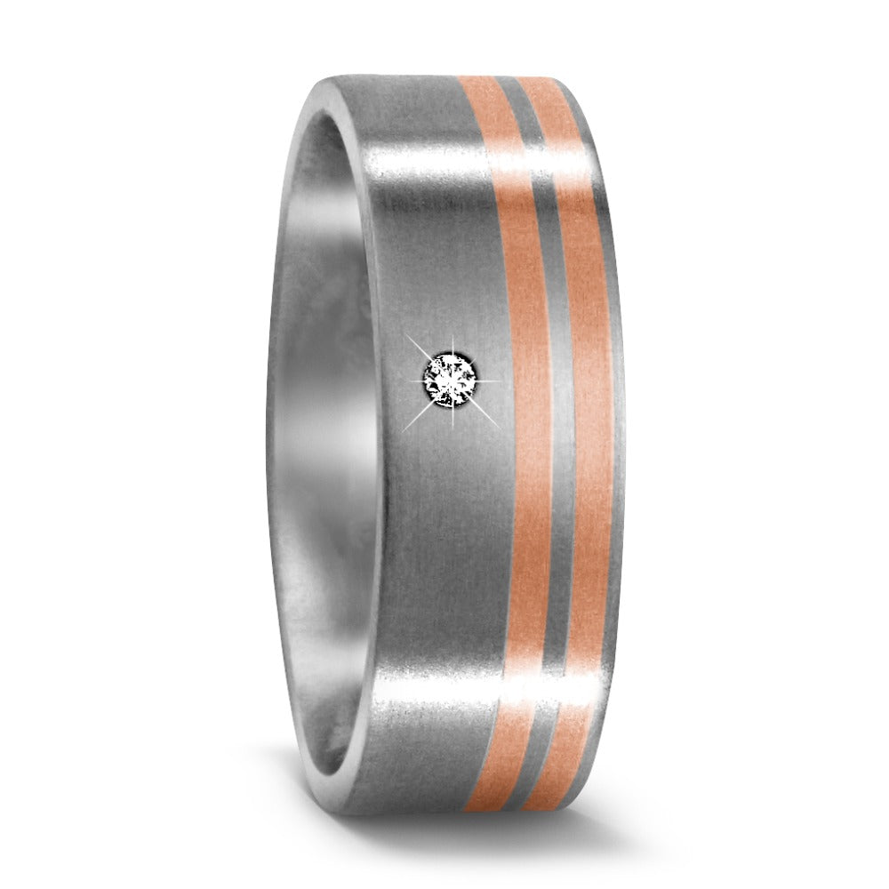 Eleganter Damen-Partnerring aus robustem Titan mit feinen 750er Rotgold-Akzenten. Der Ring besticht durch zwei dezente Rotgoldstreifen und einen funkelnden Diamanten, der dem Schmuckstück einen besonderen Glanz verleiht. Perfekt für verliebte Paare.