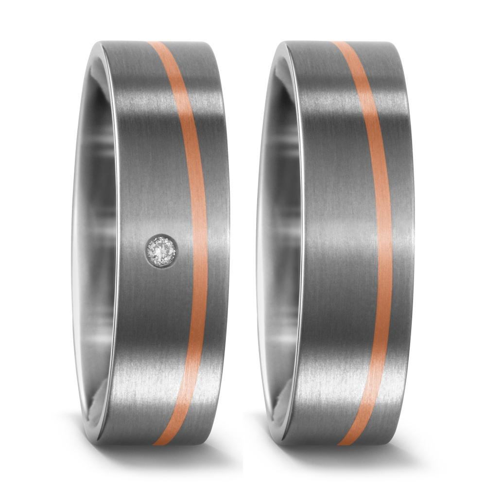 Moderner Damen-Partnerring aus hochwertigem Titan mit eleganter 750er Rotgold-Einlage. Ein funkelnder Diamant verleiht dem Ring eine besondere Note. Perfekt für Paare, die zeitlose Qualität und stilsichere Akzente schätzen. Robust, angenehm zu tragen und edel im Design.