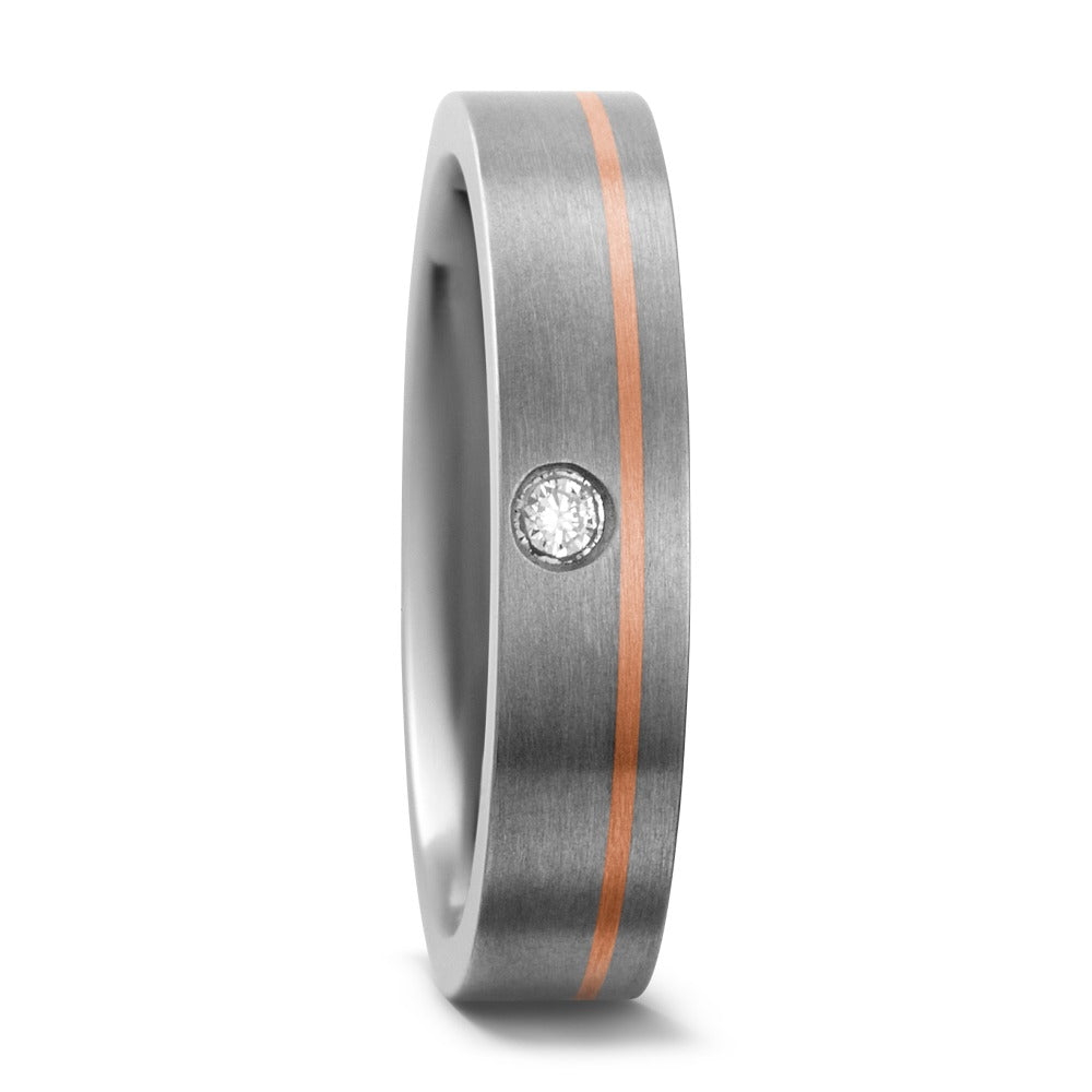 Eleganter Damen-Partnerring aus robustem Titan mit feinem Einsatz aus 750er Rotgold und einem funkelnden Brillanten. Das moderne, mattierte Design vereint Stärke und Stil und macht diesen Ring zum perfekten Symbol für Ihre Liebe und Verbundenheit.