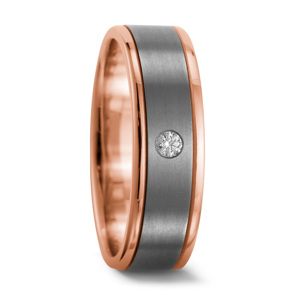 Eleganter Damen-Partnerring aus robustem Titan mit edlem 750 Rotgold-Rand. Der Ring besticht durch einen funkelnden Diamanten in der Mitte und vereint zeitlose Schönheit mit moderner Eleganz – perfekt für besondere Momente und bleibende Verbundenheit.