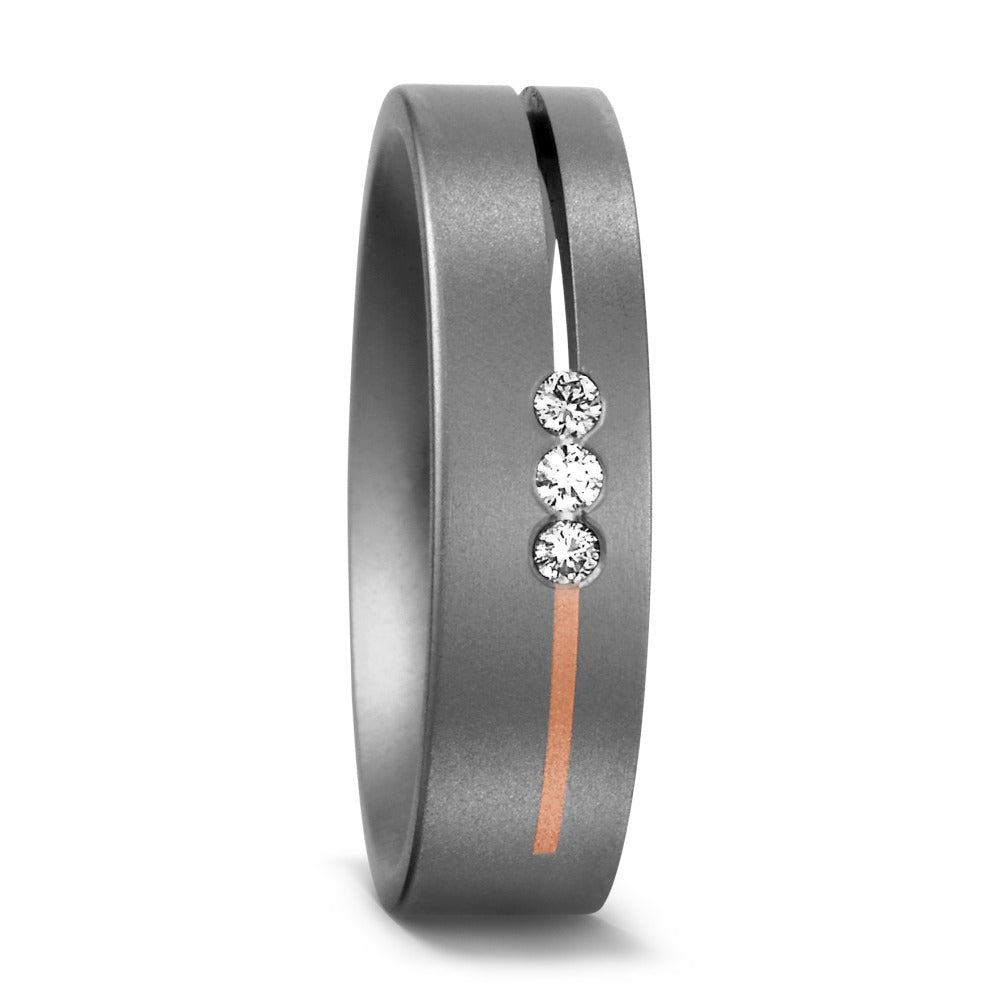 Dieser elegante Damen-Partnering aus robustem Titan besticht durch eine edle 750 Rotgold-Inlay-Verzierung. Drei funkelnde Diamanten verleihen dem Ring einen zarten Glanz und machen ihn zum perfekten Symbol für Ihre Liebe – modern, schlicht und zeitlos schön.
