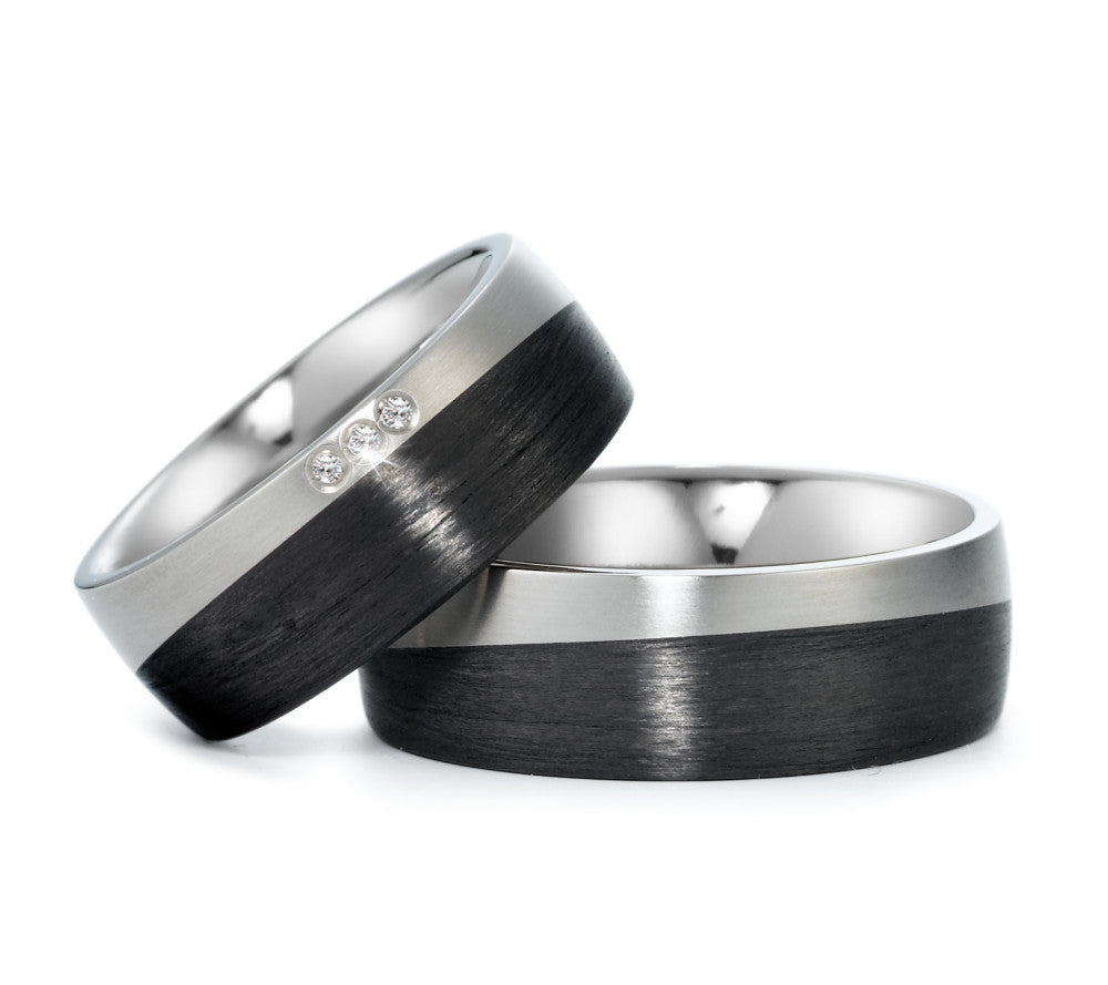 Eleganter Damen-Partnerring aus robustem Titan und edlem Carbon. Veredelt mit drei funkelnden Diamanten, kombiniert dieser Ring moderne Materialien mit klassischem Design. Perfekt für Paare, die Stil und Beständigkeit schätzen – zeitlos und individuell.