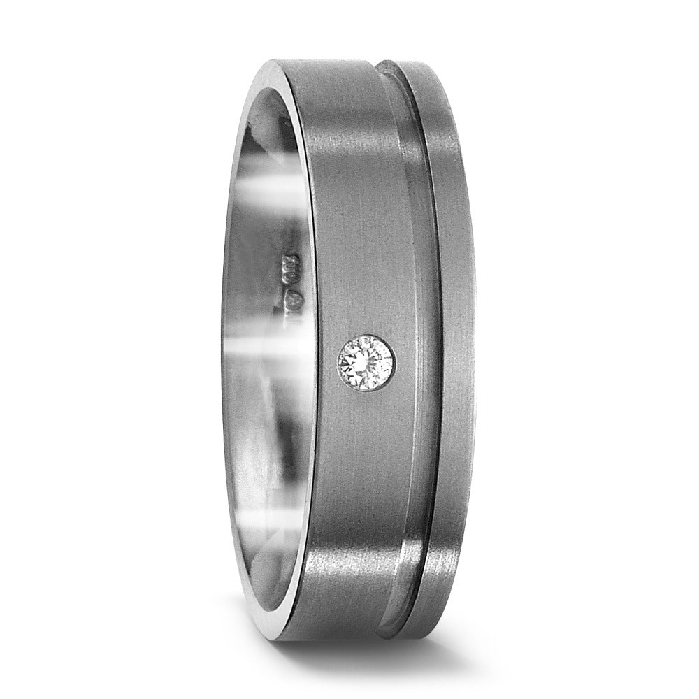 Modischer Damen-Partnerring aus robustem Titan mit mattierter Oberfläche. Das schlichte Design wird durch eine feine Rille und einen funkelnden Diamanten elegant ergänzt. Perfekt als Zeichen der Verbundenheit – zeitlos, langlebig und stilvoll.