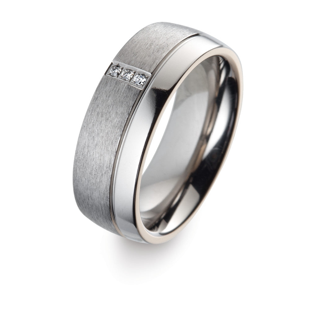 Moderner Damen-Partnerring aus robustem Titan mit edlem, mattem Finish und poliertem Rand. Drei funkelnde Diamanten setzen elegante Akzente und verleihen dem Ring zeitlose Eleganz. Perfekt für besondere Momente und als Symbol der Verbundenheit.