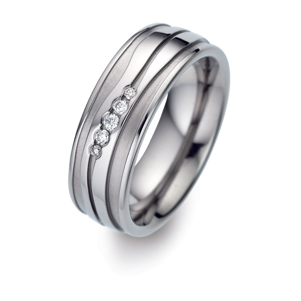 Eleganter Damen Partnerring aus hochwertigem Titan, veredelt mit fünf funkelnden Diamanten. Das moderne Design kombiniert matte und glänzende Oberflächen und steht für zeitlose Verbundenheit. Der perfekte Ring für besondere Momente und dauerhafte Liebe.