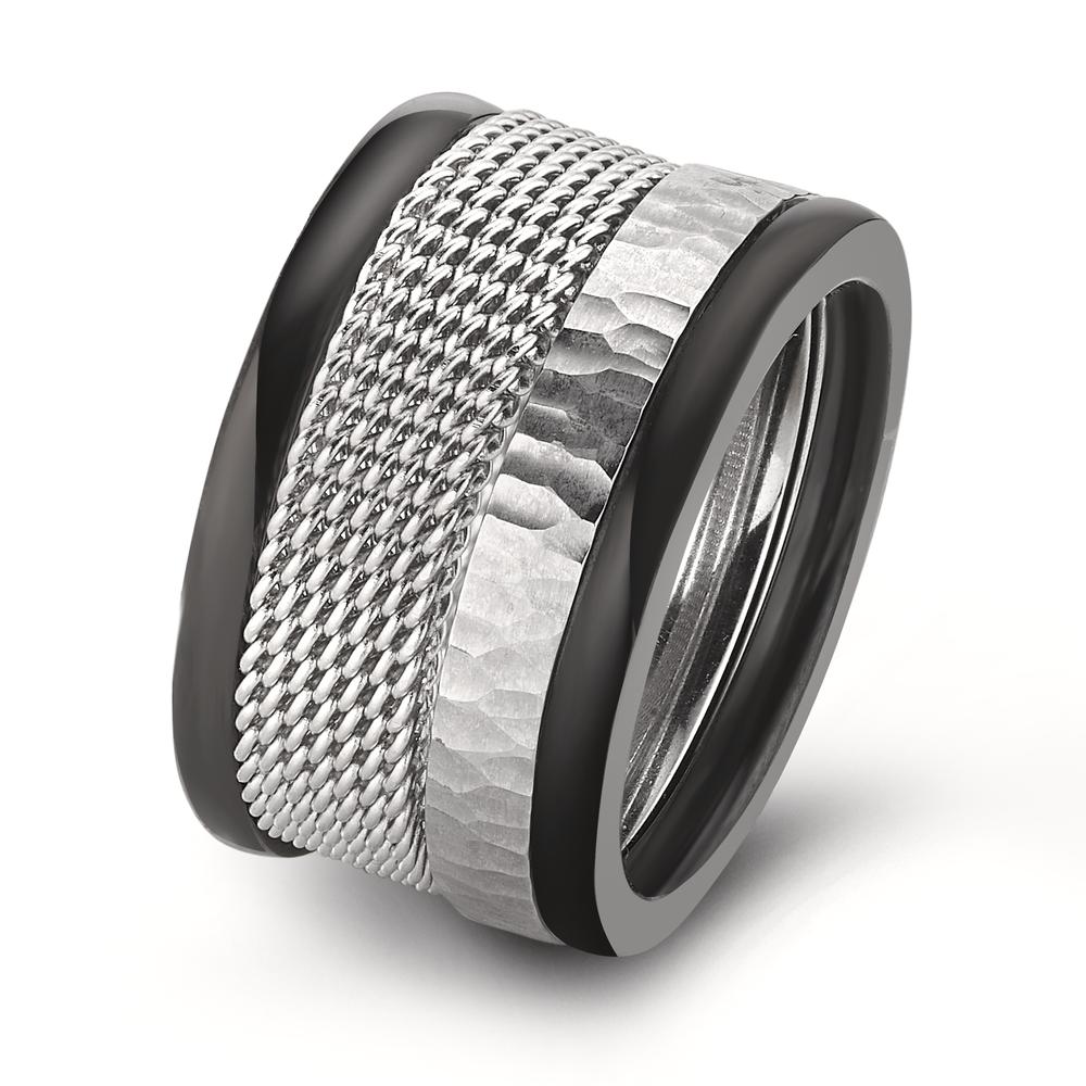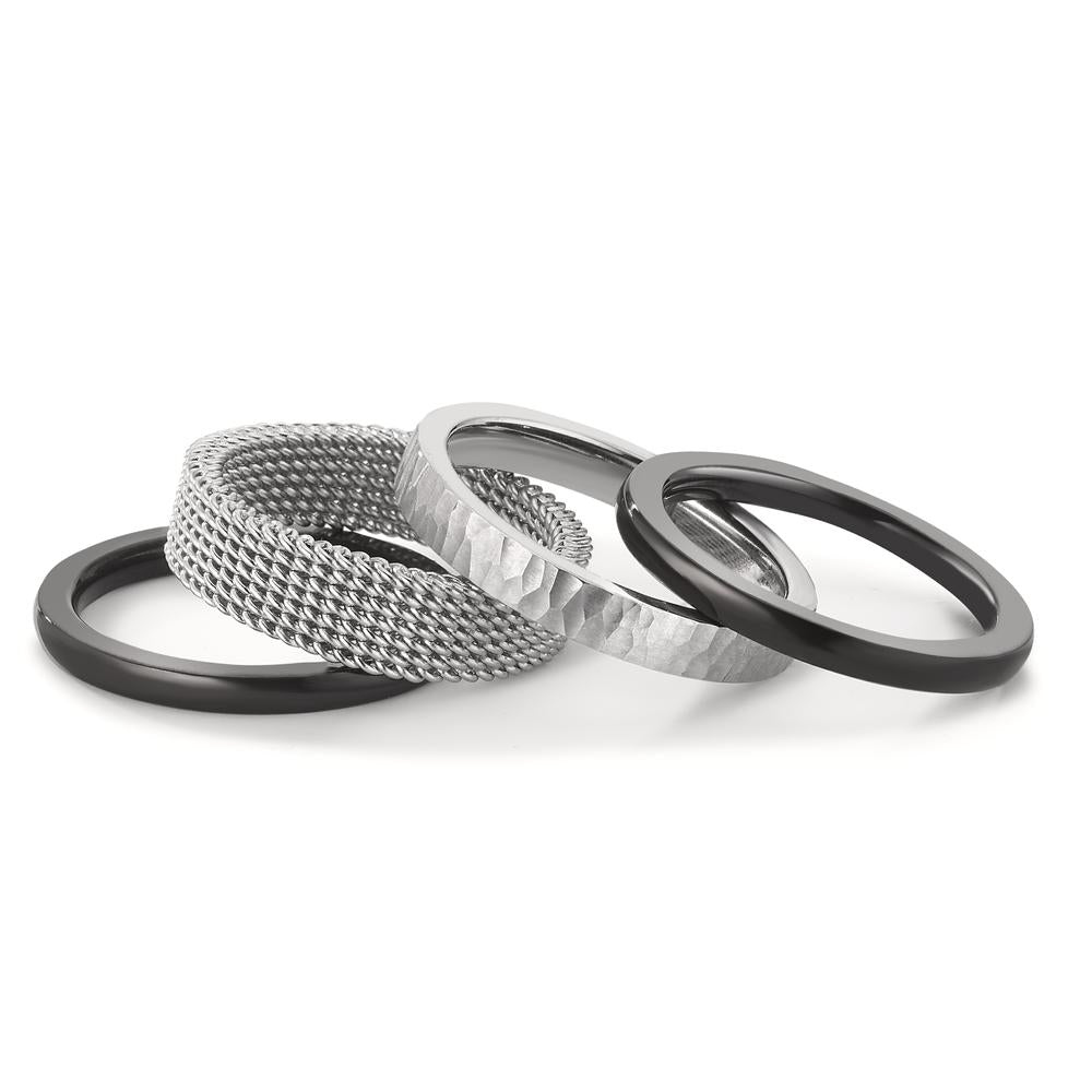 Stilvolles Damen Ringset aus hochwertigem Edelstahl mit harmonischer Kombination aus mattiertem und glänzendem Finish. Die modernen schwarzen Akzente und die elegant strukturierte Oberfläche verleihen dem Schmuckstück ein trendiges, unverwechselbares Design – perfekt für jeden Anlass.