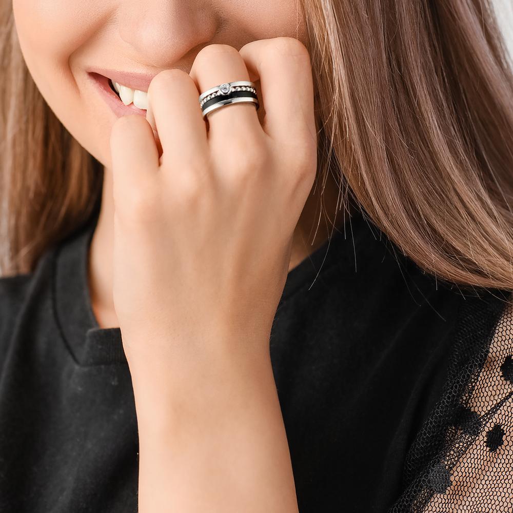 Elegantes Damen Ringset mit funkelndem Zirkonia. Das Set besticht durch moderne Kombination aus poliertem Silber und schwarzem Akzent, ergänzt durch eine stilvolle Kugelstruktur. Perfekt für jeden Anlass – zeitloser Schmuck mit edlem Look für die modebewusste Frau.