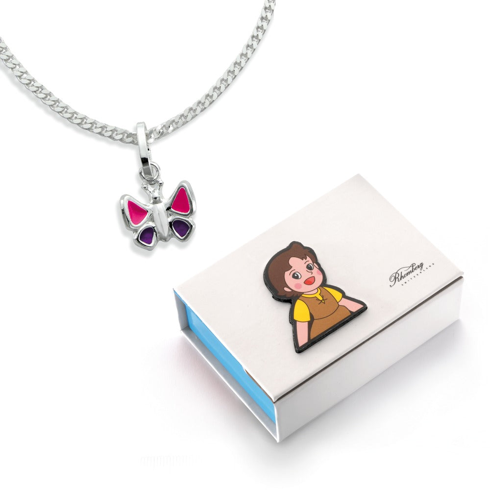 Süßes Mädchen-Set mit silberner Schmetterlingskette, liebevoll gestaltet mit pink-lila Flügeln. Ideal als Geschenk für kleine Mädchen, die Schmuck lieben. Das Set wird in einer hübschen, kindgerechten Geschenkbox geliefert – perfekt für besondere Anlässe und jeden Tag.