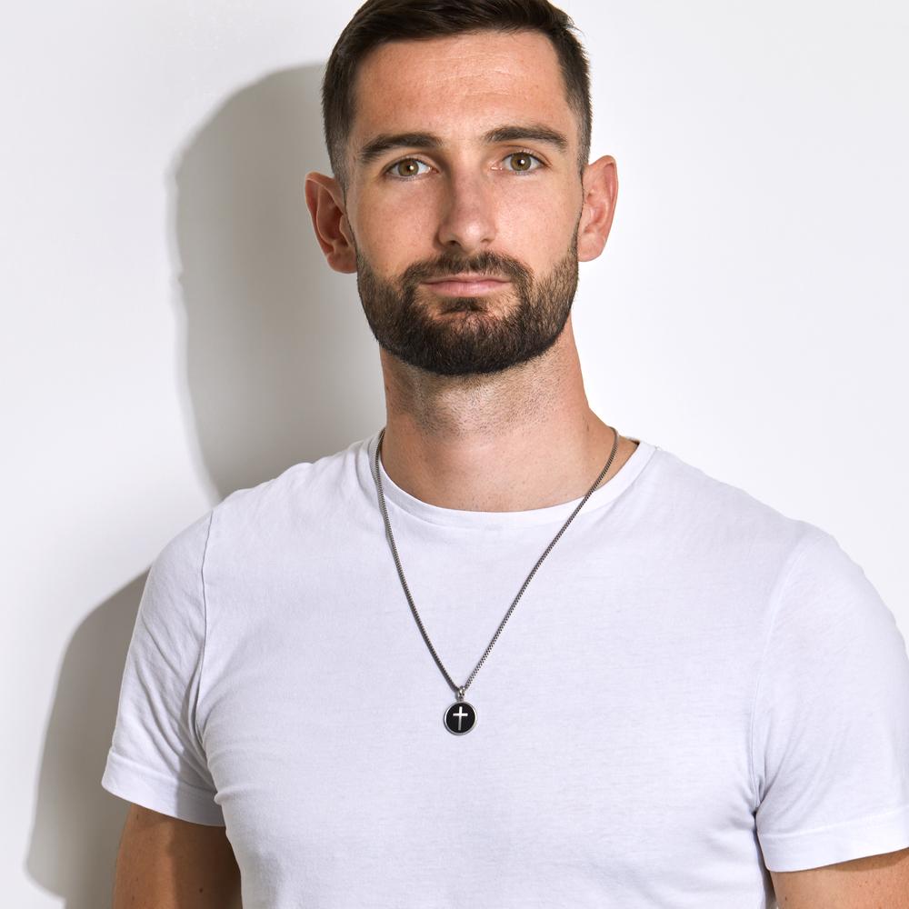Moderner Herrenanhänger aus hochwertigem Edelstahl mit stilvollem Kreuz-Motiv. Der runde, schwarz hinterlegte Anhänger vereint zeitlose Eleganz und robuste Qualität – perfekt für den Alltag oder besondere Anlässe. Ein symbolträchtiges Accessoire für Männer mit Stil.